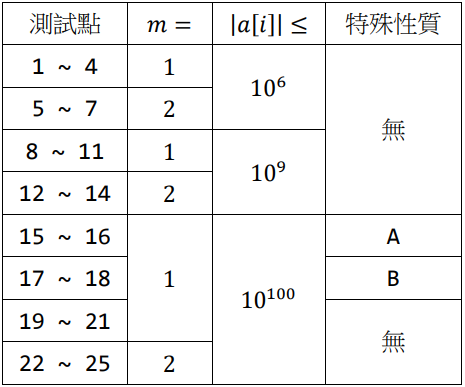 • 若 m=2,則對於所有滿足 1≤i≤n 的整數 i,a[i]≥1。